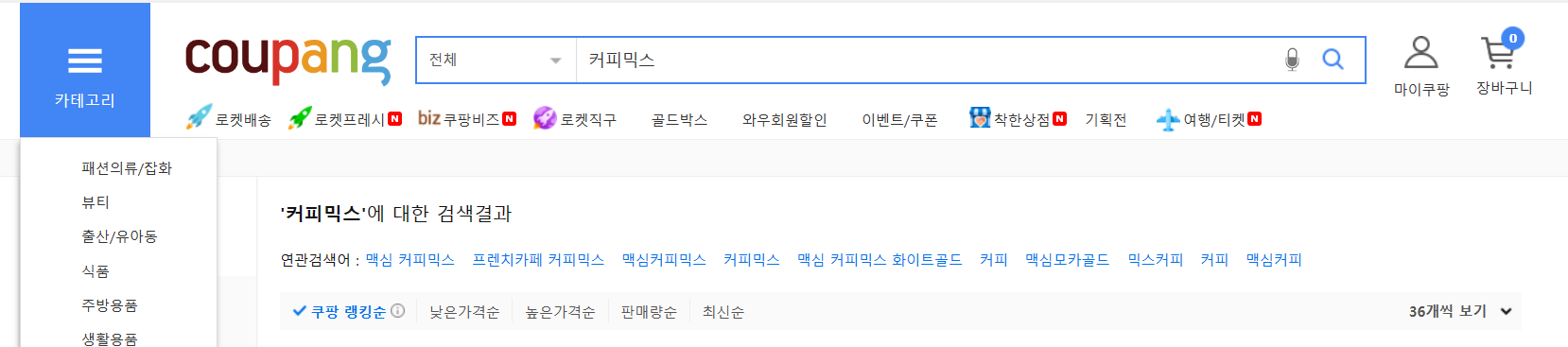 국내 최대 쇼핑 플랫폼인 쿠팡의 커피믹스 가격비교 입니다.